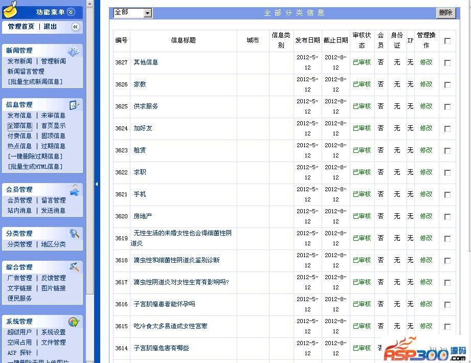 (C)全部信息:显示本站的所有信息,可以对信息进行修改/删除/审核/查看信息来源IP地址/等功能;