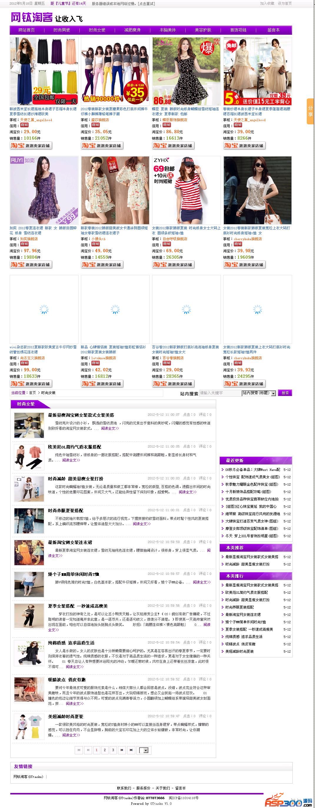 在网钛文章管理系统OTCMS基础上,保留文章功能,去掉其他非文章功能,并着重加入淘宝客元素和淘宝客功能。 当前V1.0版本主打淘宝客单品功能,可以随意设置淘宝客商品在首页、列表页、内容页显示,同时也可以限制只在某个栏目里显示。前台显示的淘宝客商品的超连接和图片路径,均采用base64加密,让搜索引擎判断不出是来至淘宝的数据,同时加入图片延时加载技术,减轻淘宝客图片对网站显示速度的影响。后期会根据大家使用反馈,来不断调整和优化该程序~网钛淘客v1.3 build 20120918更新内容:1.单品推广模式新增最大显示数量限制