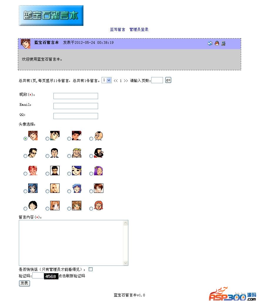 蓝宝石留言本是一个操作方便,界面美观的留言本。后台内置留言本参数修改功能,配色修改功能和留言本头像切换功能,本留言本使用access数据库。本留言本具有sql防注入功能。