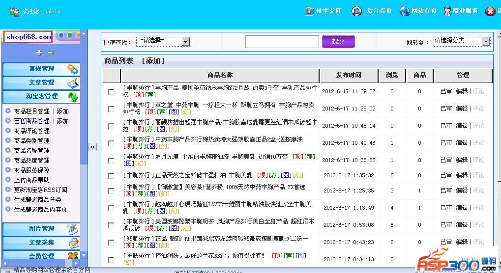 668CMS专业女性淘宝客网站管理系统,内核由老Y文章管理系统,138CMS而来!采用Asp+Access开发,适应中小新闻文章类型或下载类型或图片类型网站及个人网站需求,整个网站采用Div+Css布局,IE6、IE7、IE8、Firefox、Chrome下测试无误。请勿用于商业用途,违者必究!
