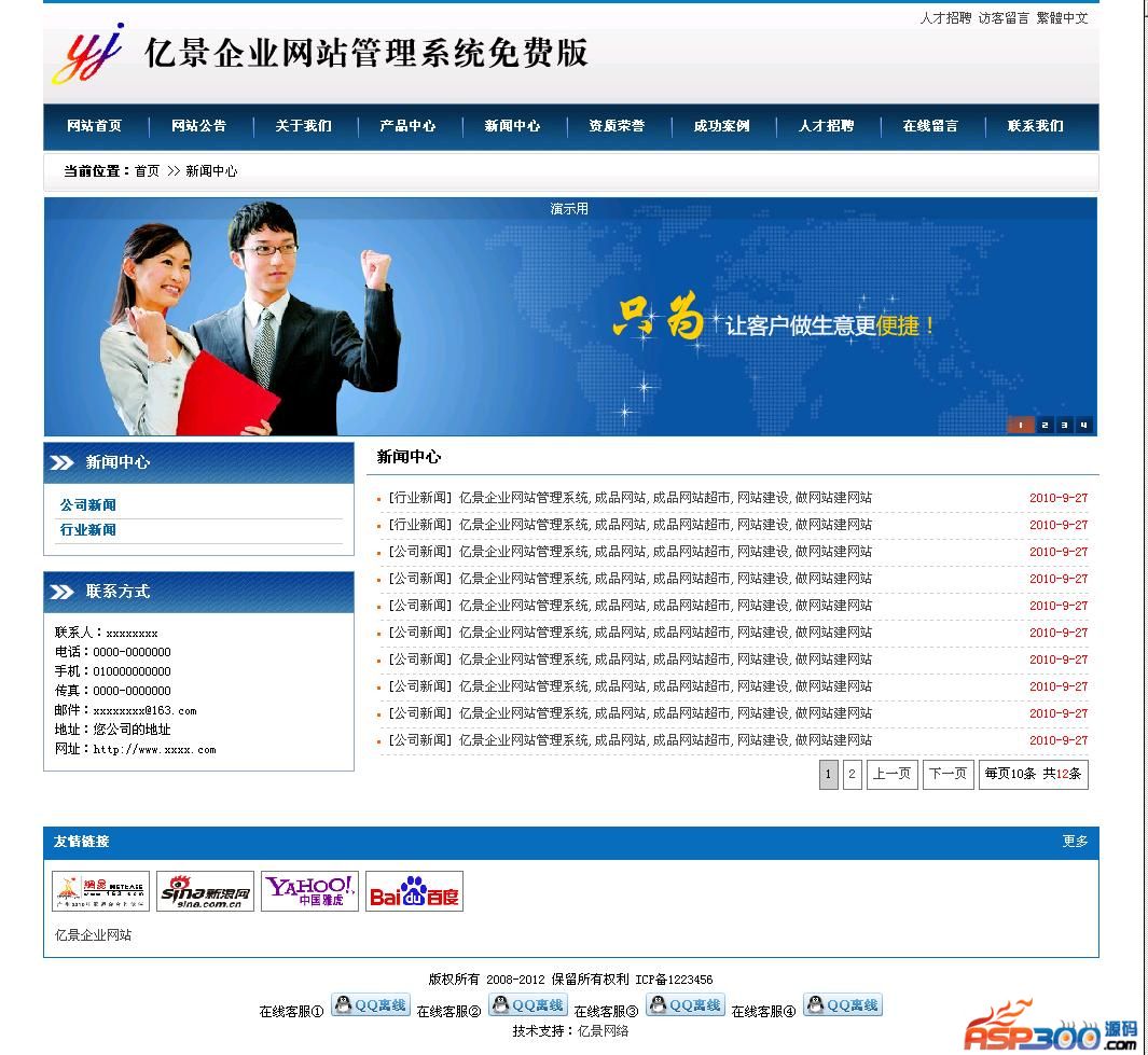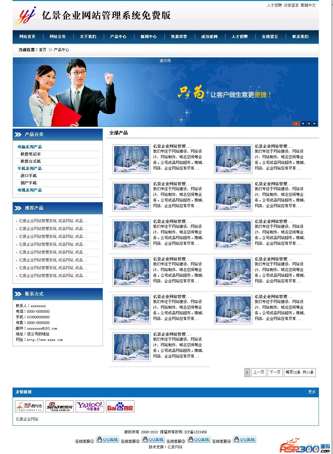 亿景企业网站管理系统是面向中小企业的网站管理系统,网页精美、大气。具有稳性定强,功能多、安全、代码加载速度快、网站内容管理的易操作性、维护方便等优点。采用div+css构架,是中小型企业建站的理想选择。