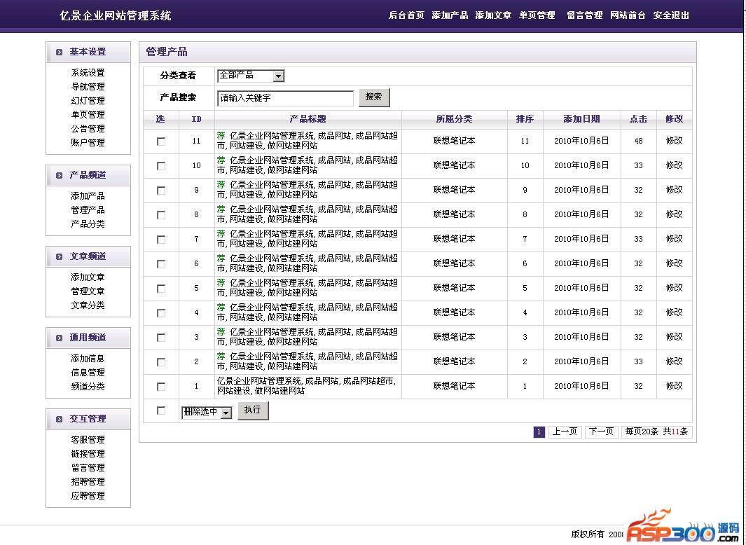 1、 系统设置:设置网站的基本信息,如网页标题、联系方式、QQ、邮箱、关键字、搜索描述等操作。