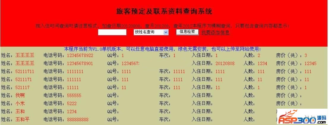 做联系人电话、QQ等信息记录也查询用。适合:旅馆业预定记录查询,企业员工信息查询等