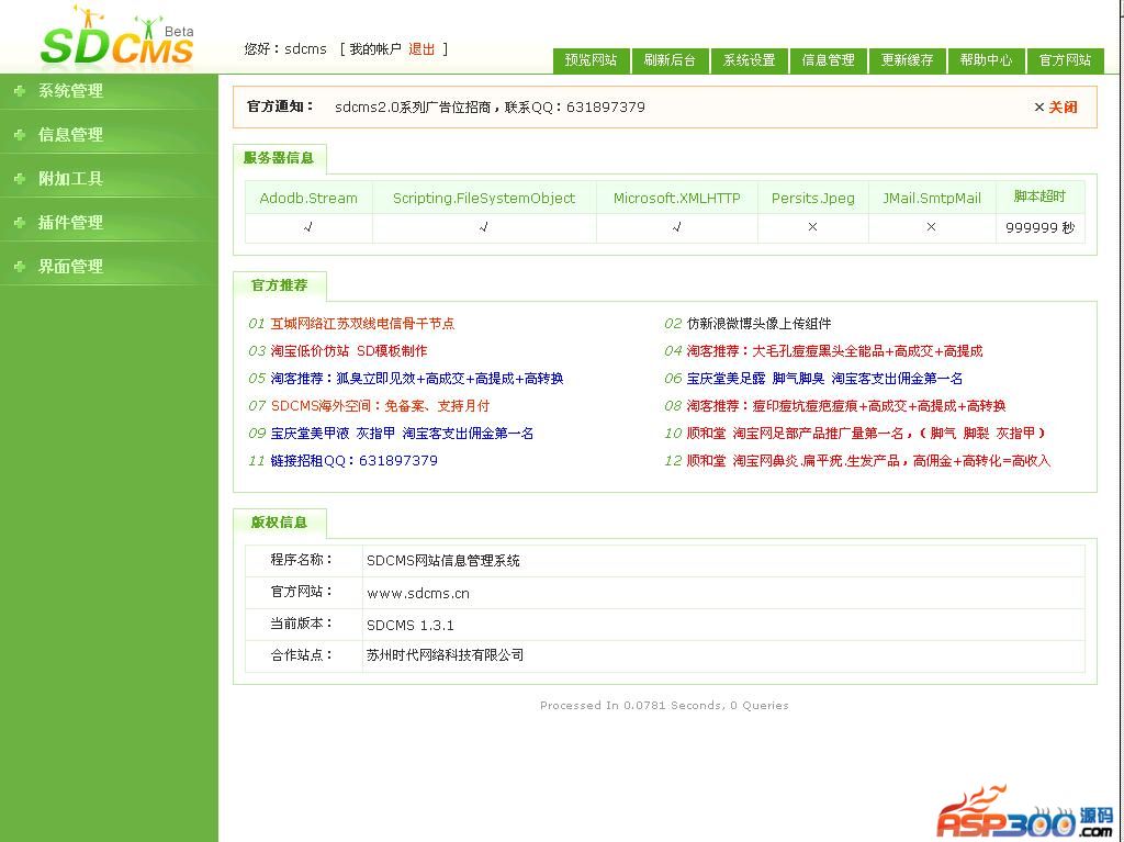 SDCMS——时代设计一套基于ASP+AJAX技术构建的网站管理系统,非常优秀的一套新生CMS系统,有着良好的界面和强大的功能,尤其是后台的操作非常快捷方便,前台均生成静态HTML页面,对搜索引擎极友好。有不少的站长朋友用这套系统做了不少网站,比如网址导航、企业网站等。