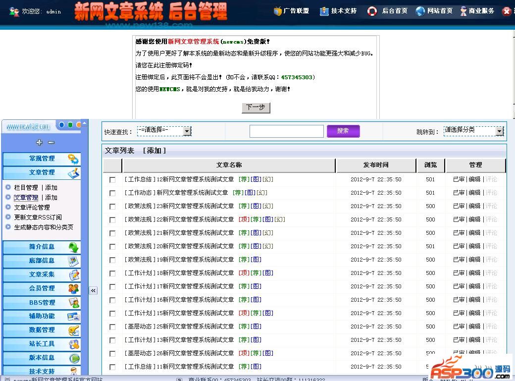 4.文章采集、广告管理、自定义标签管理、图片文章、正文分页、批量删除、二级栏目、栏目关键字。