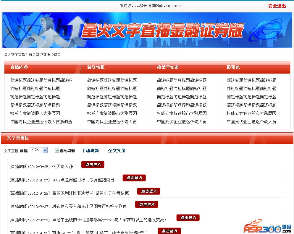>星火直播系统是由媒体行业及金融行业专家顾问指导下开发的一套实用、高效、功能强大的文字直播平台。目前功能主要以文字发布,在线访谈,证券指导为主。它是集功能完善的直播系统、访谈系纺、网友留言系统、新闻发布系统于一身的网站综合管理系统,它适用于有对外发布信息需要的企事业单位(行政事业版)、媒体网站对外发布信息和在线访谈(媒体访谈版)、证券从业人员及有股市操作经验的分析师在一定范围内发布内幕文章、言论,提醒和指导会员交易、交流互动学习的平台(金融证券版)。其中行政事业版和媒体发布版是开放形式互动交流,而金融证券版是会员制的互动交流,会员在有效时间内可进行跟综,浏览、互动的学习交流。
