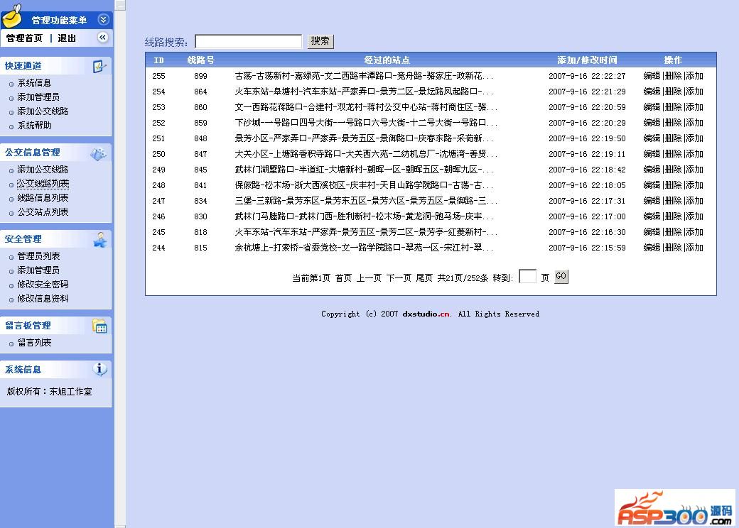 要查询这些线路、站点以及换乘需要很多的信息表来合作完成。所以不免要更多的添加信息。这样子导致了后台庞大的数据信息管理的困难。为此特别开发了所有有关数据表自动生成的功能,所谓的自动的生成就是不需要管理员多次的去添加相关的信息,而是通过添加一条基本线路信息的同时系统会通过管理员提交的信息把其他所有的相关信息都一并生成且添加到相应的数据表中。从而这么庞大的数据库管理简化成了直接管理一个数据表就行了。修改数据也一样,修改一条线路信息的时候其他所有的相关信息都会随着管理员提交的修改资料而做相应的变动。这样子简化了管理员沉重的管理负担,简捷且不会出现很多站点与线路不对应的错误。保证数据的准确性……增设留言板