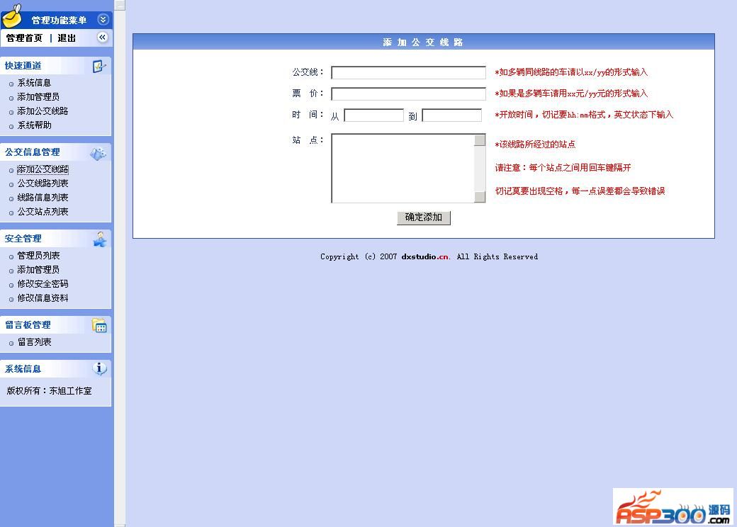 本系统支持模糊查询,可以为用户提供更大的搜索空间,一些用户只知道一些信息的个别字而不知道自己要找的全部信息的话,系统就会自动执行模糊查询,查出数据库中所有与用户输入的信息有关的信息供用户选择进行重新查询。这样子用户就不必担心找不到自己所需要的站点或线路。给了用户更大的空间。后台登录: