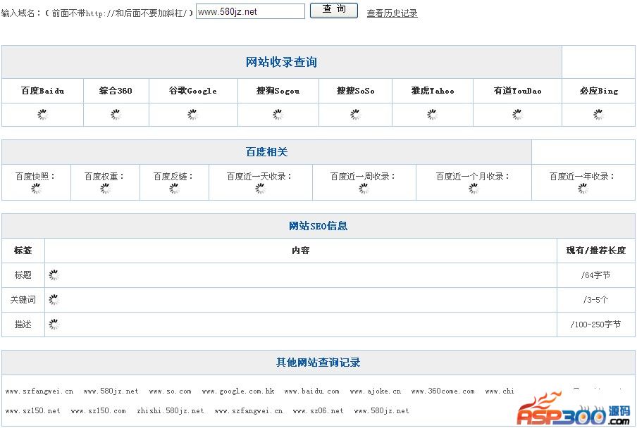 本程序主要功能为各大搜索引擎网站收录查询和百度相关查询,网站SEO信息查询