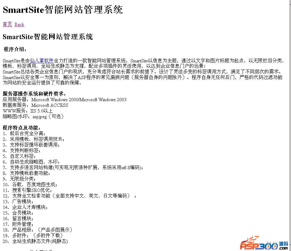 智能移动网站管理系统( SmartMobile )是由仙人掌软件基于asp+access/html5/jquery mobile/css、php+mysql/html5/jquery mobile/css3环境下开发的企业级移动网站管理系统。SmartMobile 内置单页、新闻、产品、视频等内容模型,在很大程度上满足了更多层次用户的需求和发展需要,兼容Android、iOS、黑莓等手机操作平台。SmartMobile 开发了全新的、高效的、灵活性更强的模板引擎。无限循环(循环嵌套)标签、自定义标签、数据缓存等功能,支持条件判断,系统函数直接调用等灵活的功能。功能及系统特点:1、完美的兼容性: