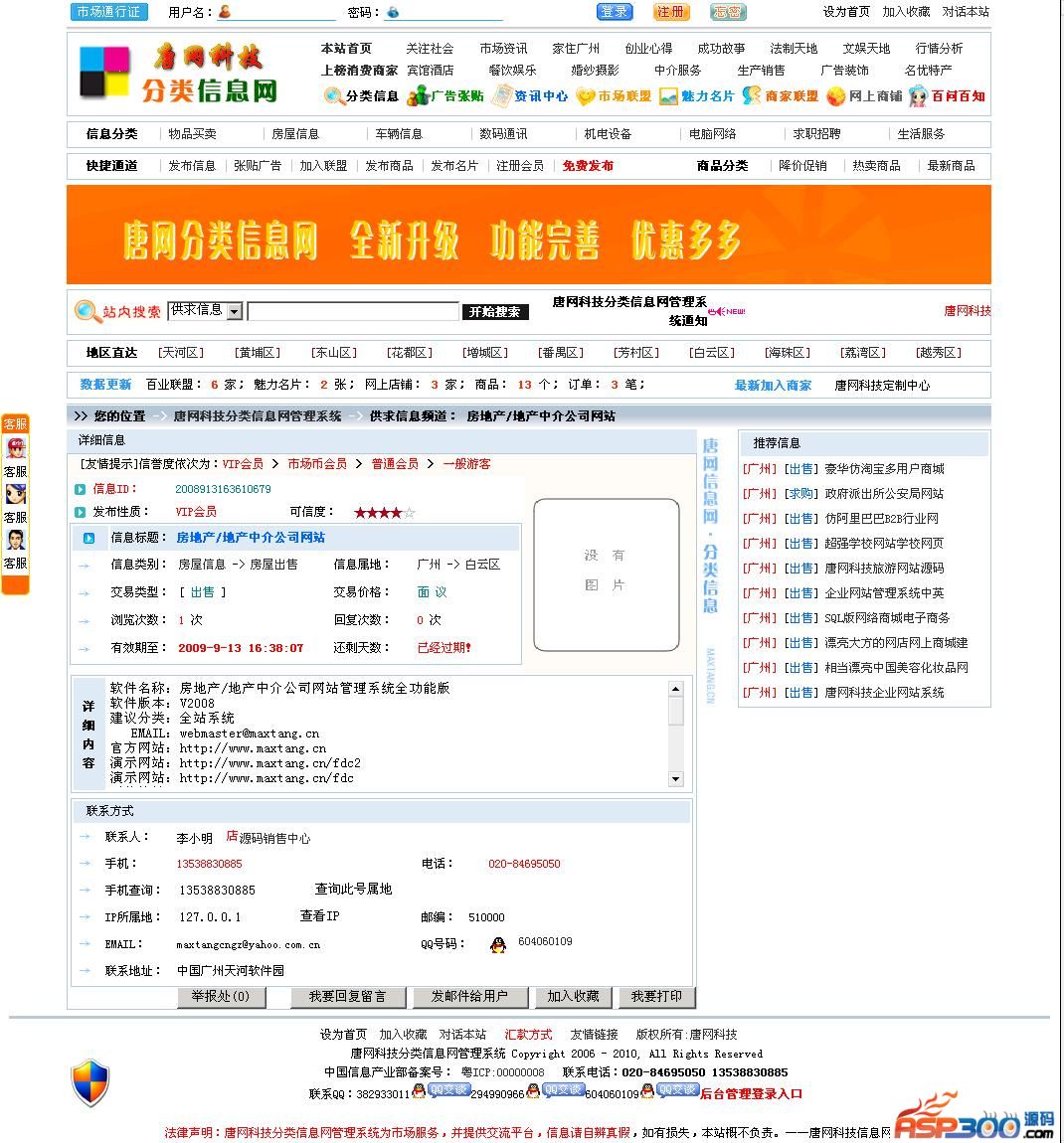 视窗门户类分类信息网,后台管理从前台网站输入admin/login.asp,管理员:admin 密码:admin 会员测试账号:maxtang 密码:123456