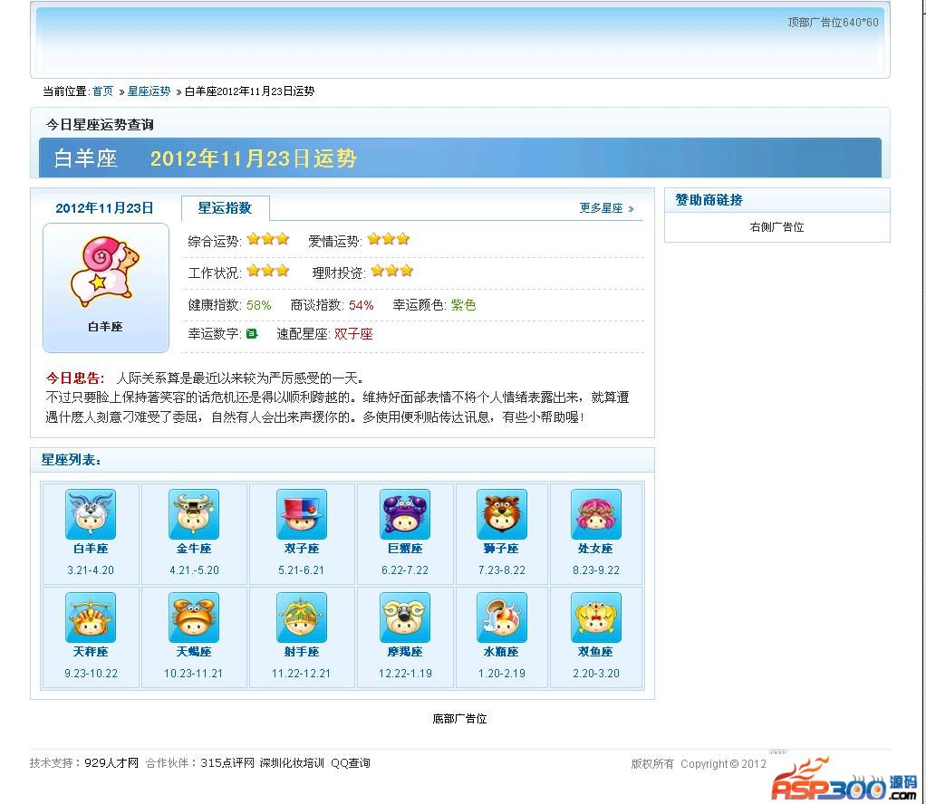 这是一套页面美观、实用性强的今日星座运势查询系统 更新交换代码结构 更快 更稳定 div+css布局 走在时尚做站的前沿 程序较为简单 下载地址 下载地址已转移到新版网站,请点击左上角-首页,在新版网站搜索此套源码的标题进行下载。