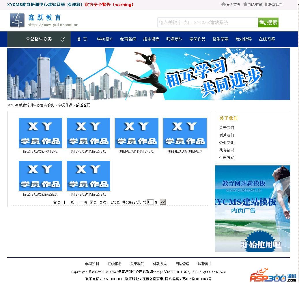 学员作品管理:添加学员作品信息,可以上传缩略图,可以进行修改、删除操作