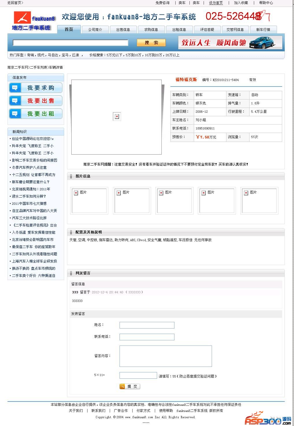 程序介绍:该二手车源码采用ASP+ACCESS开发,功能清晰,程序简单适合二次开发,程序支持游客发布信息,网站栏目设有二手车出售、求购、出租、评估答疑、交管信息、新车行情等,适用于本地二手车及汽车服务公司建站使用。
