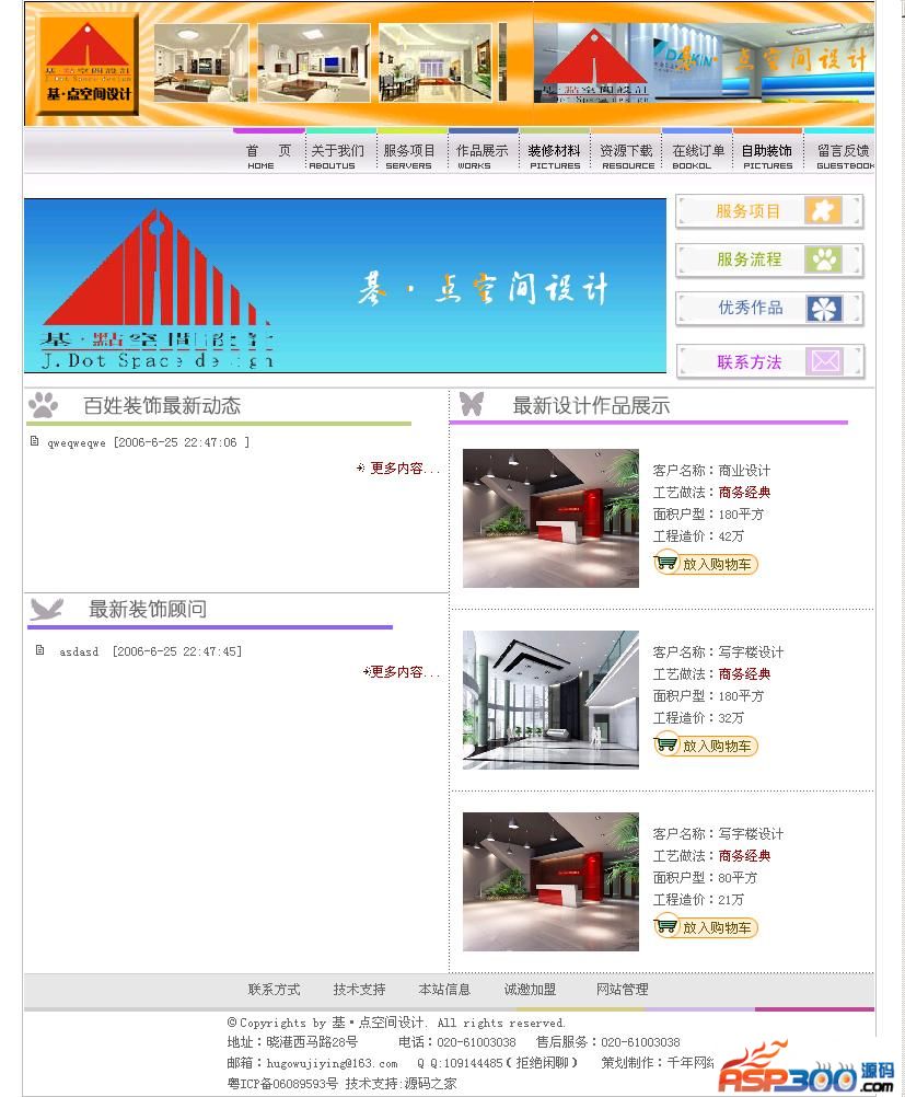 装饰设计公司网站源码,可管理网上客户下的订单,管理客户留言等。 后台管理:/admin/login.asp 管理员:admin 密码:admin 下载地址 下载地址已转移到新版网站,请点击左上角-首页,在新版网站搜索此套源码的标题进行下载。