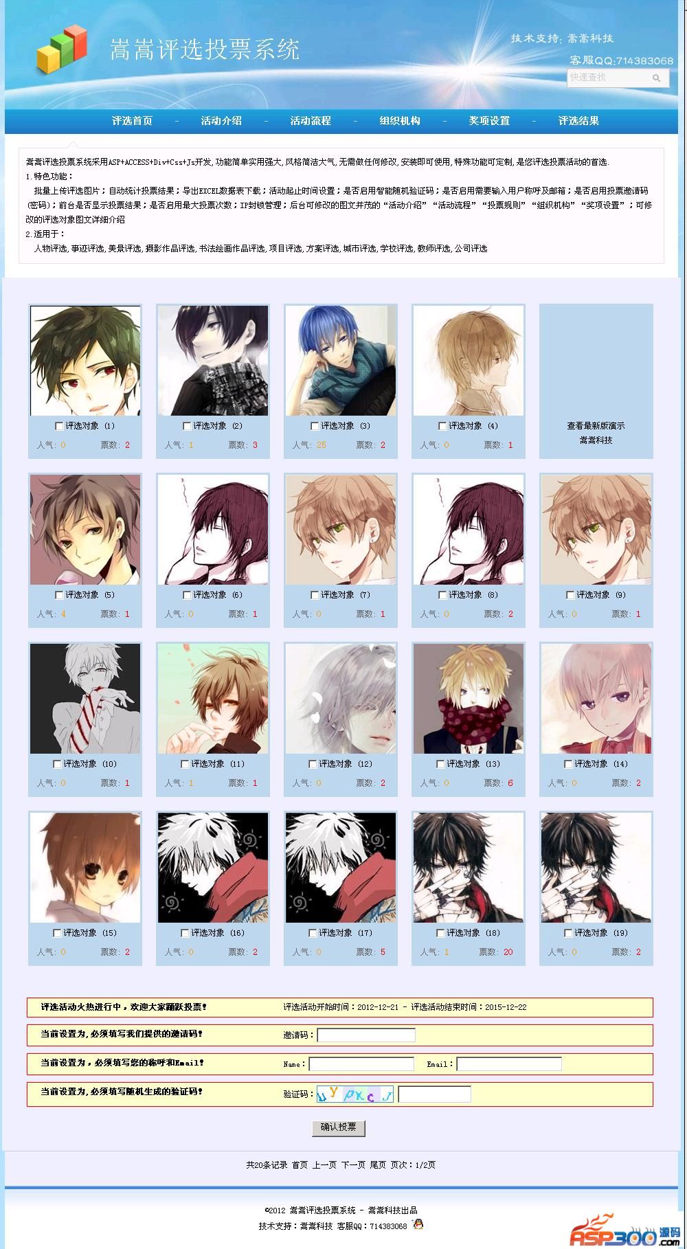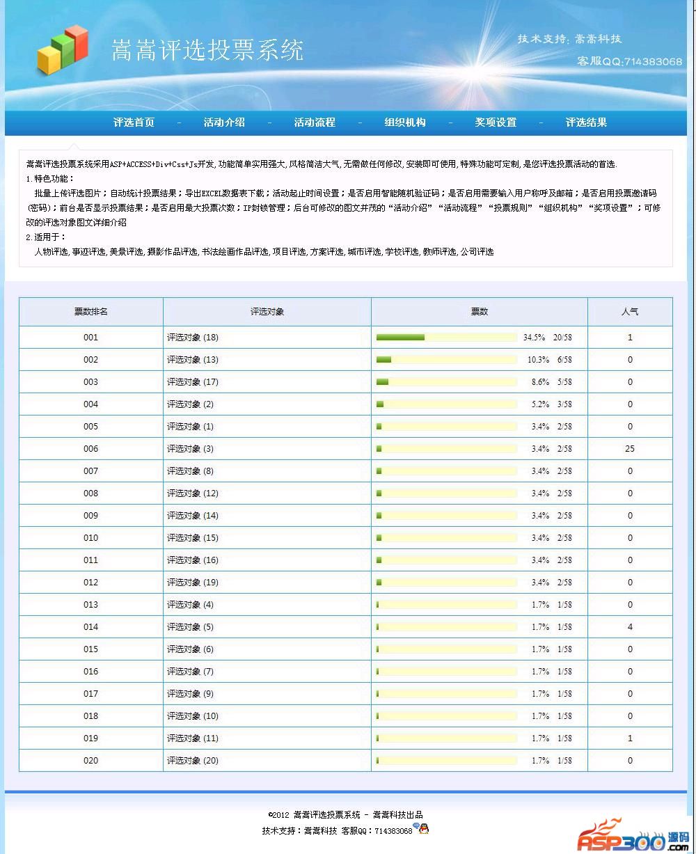 嵩嵩评选投票系统采用ASP+ACCESS+Div+Css+Js开发,功能简单实用强大,风格简洁大气,无需做任何修改,安装即可使用,特殊功能可定制,是您评选投票活动的首选。