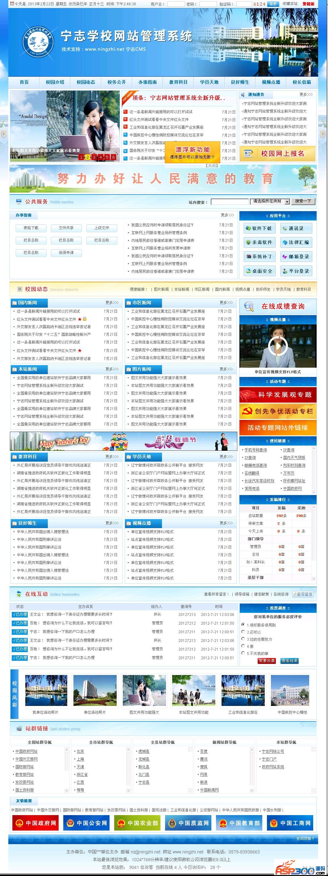 宁志网站管理系统是国内知名建站软件,它由技术人员开发好了的一种现成建站软件,主要为全国各地方政府、公安、事业单位、企业公司、自助建站提供方便。网站系统无复杂的安装设置要求,适合广大工作人员使用。特点:安全、稳定、美观、实用、易操作...可设管理员权限分配。