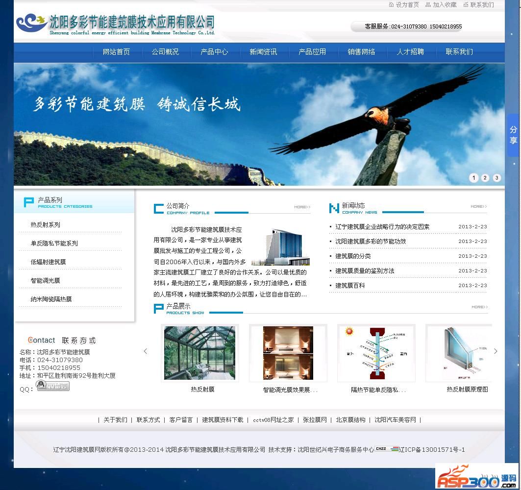 建筑膜网由沈阳世纪兴电子商务服务中心独家为沈阳多彩节能建筑膜技术应用有限公司开发,与元宵节正式上线,现通过asp300源码站免费为大家开源共享全站代码,附有404错误处理页,用户名和密码是admin,如有问题请到官方站www.lnjyzy.com进行在线留言,我们业余时间会为您解答各种建站疑难问题。