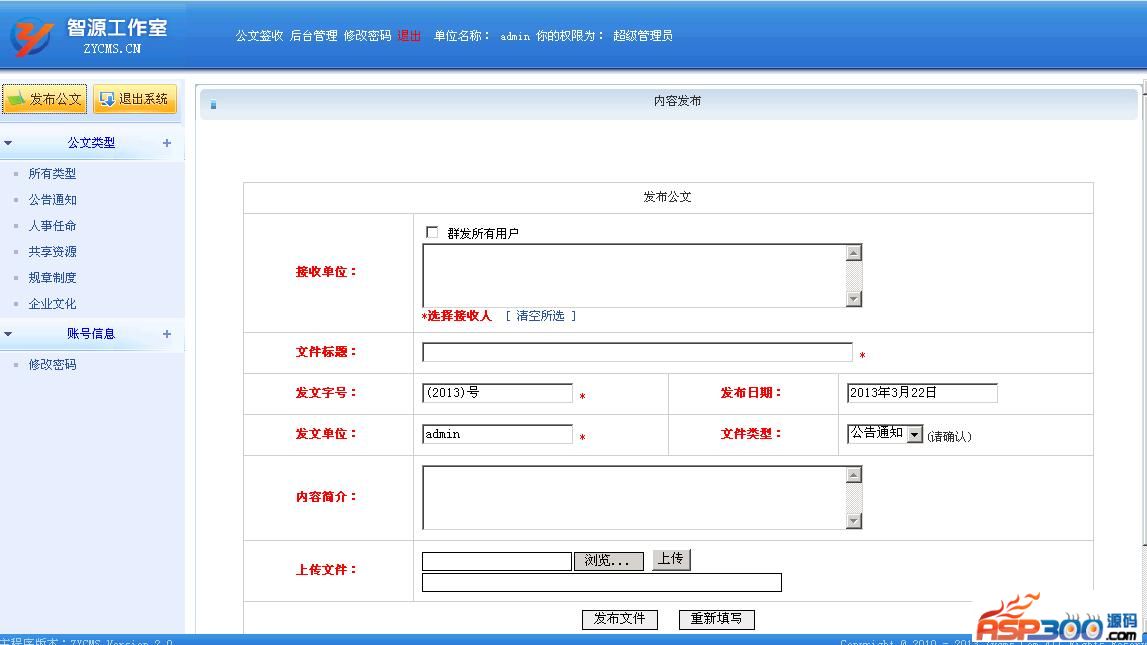 公文下发和上报管理: 在发布和上报文件时,输入文件文号、标题、类型、发文(上报)单位、选择文件正文等,然后设置