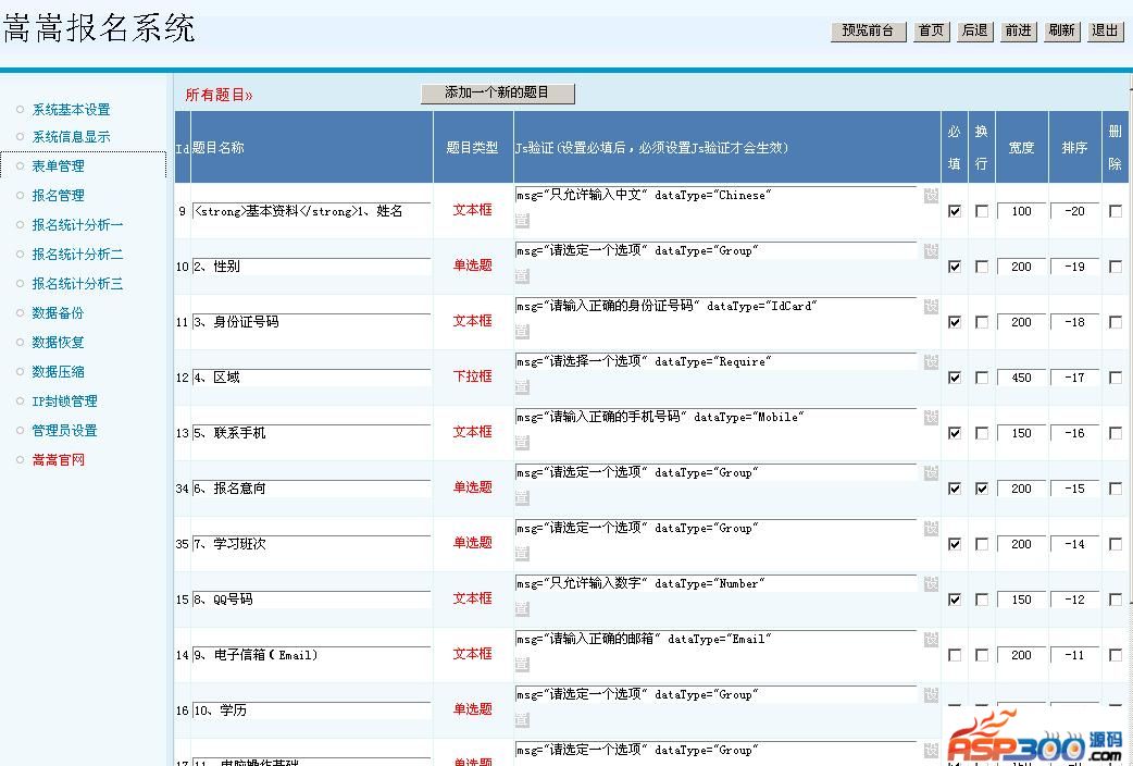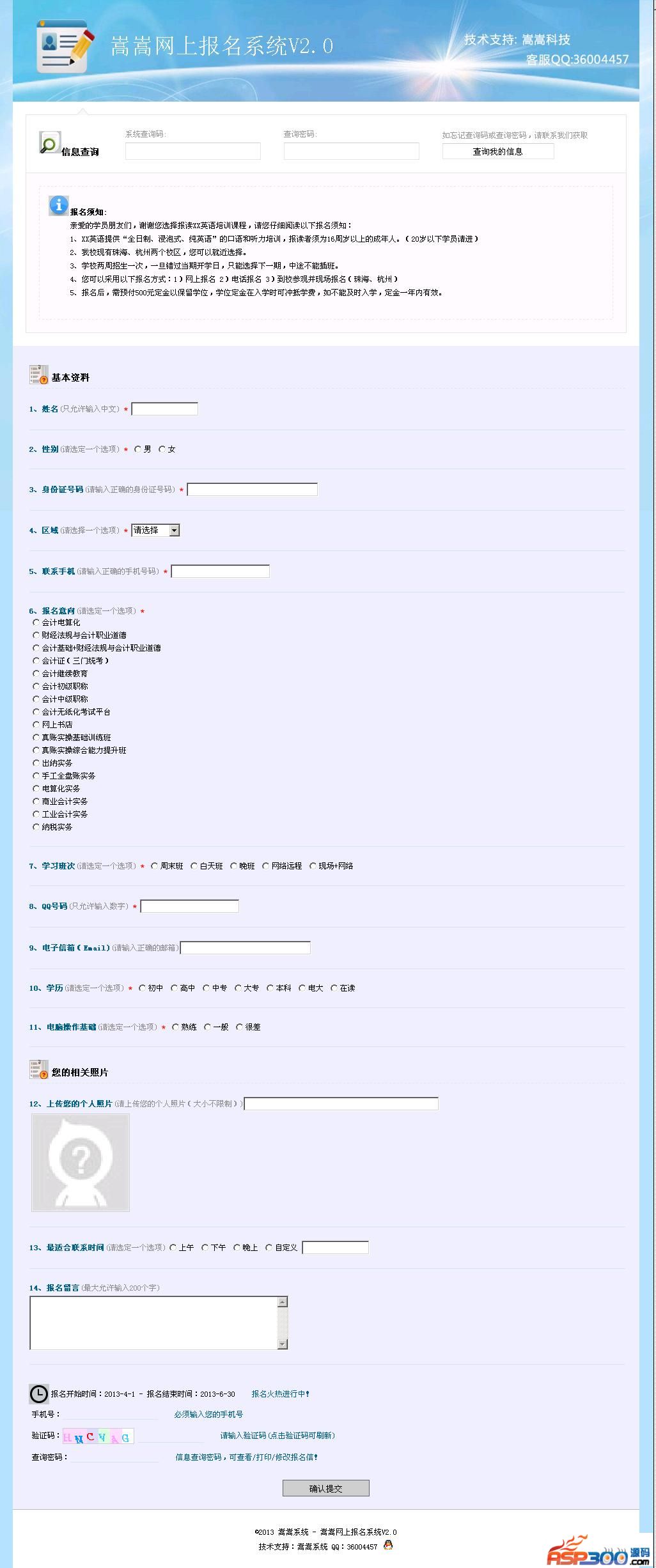 嵩嵩在线报名系统,只要支持ASP环境,不需任何修改即可运行,报名表单,支持多达8种自由设置的组合方式。