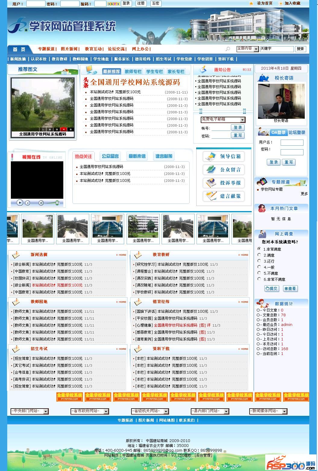 完美的ASP编程的学校网站源码,后台功能非常强大,并参考目前众多流行的国内国外学校网站模板重新做了美化,非常漂亮的学校网站模板,适用于各学校网站建设的网站源码,学校网站管理系统,学校事业单位网站管理系统,Asp+ACCESS的完美结合,高效的页面执行效率,特别优化系统安全性能,可令你在学校茫茫网海中一支独秀。学校网站管理系统正式版助中国各级学校行政单位走上信息化道路,学校单位网站管理系统正式版助中国学校走上网络,为公众服务,学校网站管理系统正式版为中国政府机构实现网上