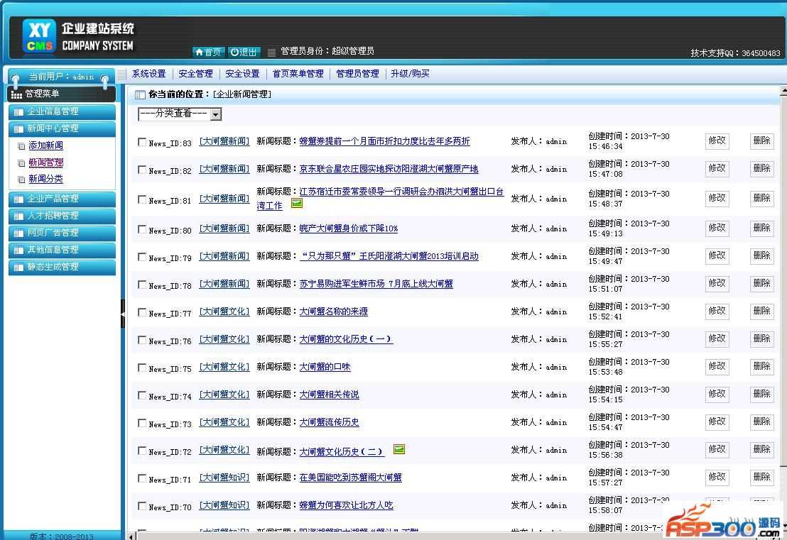 新闻中心管理:管理新闻信息内容,管理相关分类,添加或者删除