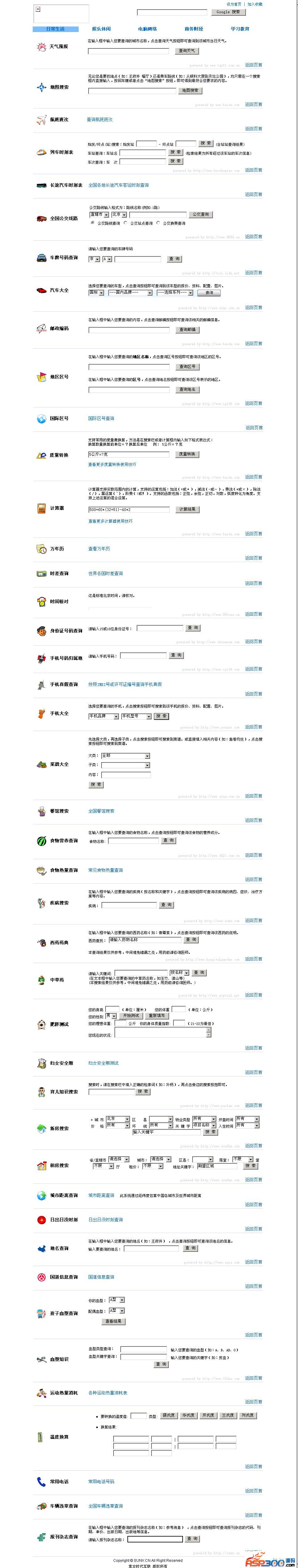 说明:界面美观干净;提供天气预报、地图搜索、航班班次、列车时刻表、长途车时刻表、全国公交线路、车牌号码查询、汽车大全 邮政编码、地区区号、国际区号、度量转换、计算器、万年历、时差查询、时间核对、身份证号查询、手机号码归属...等等共计160多项查询服务;适合于任何网站使用。
