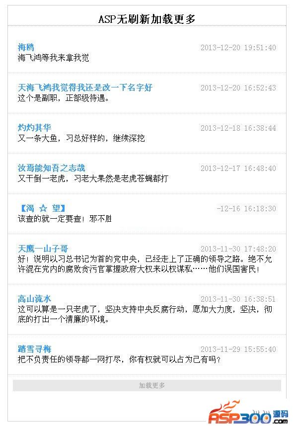 我们在一些腾讯网站评论栏目上可以看到这样的应用,列表没有使用分页条,而是一次加载一定数量的记录显示在列表页,当用户浏览到列表页底部时,可以通过单击“加载更多”来查看更多记录。