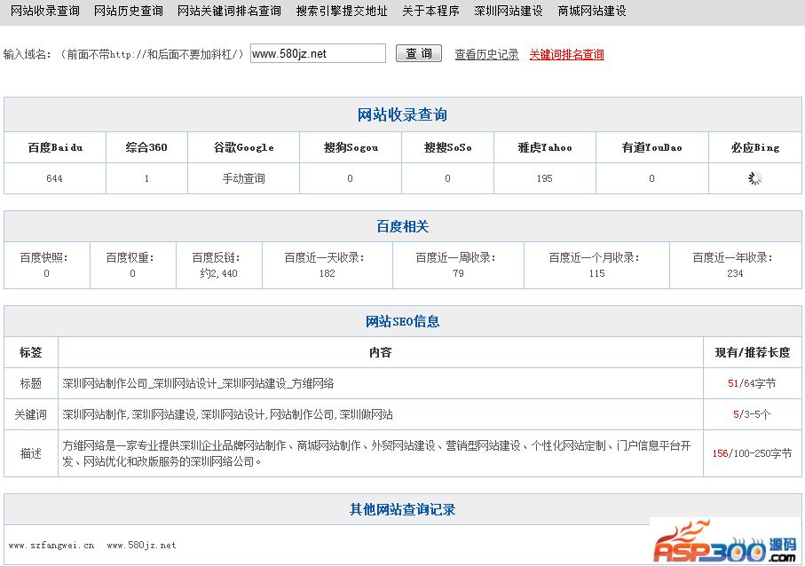 本程序主要功能为各大搜索引擎网站收录查询和百度相关查询,网站SEO信息查询