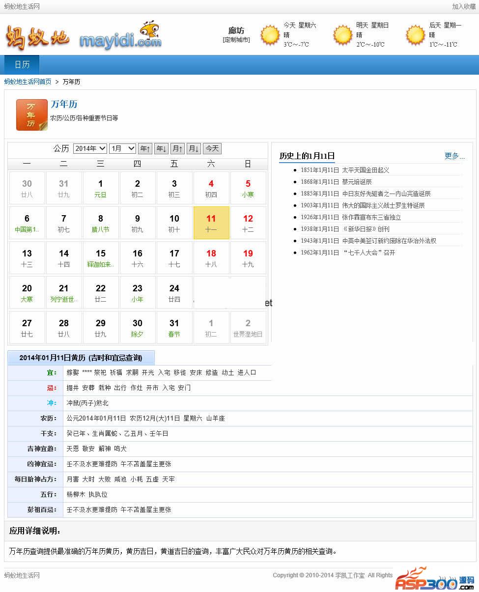 蚂蚁地万年历黄历查询是一款用来在网站上显示日历农历黄历和与其相关信息的asp源码,界面采用DIV+CSS布局,美观大方。 修正2014年吉时和宜忌查询不能读取h 下载地址 下载地址已转移到新版网站,请点击左上角-首页,在新版网站搜索此套源码的标题进行下载。