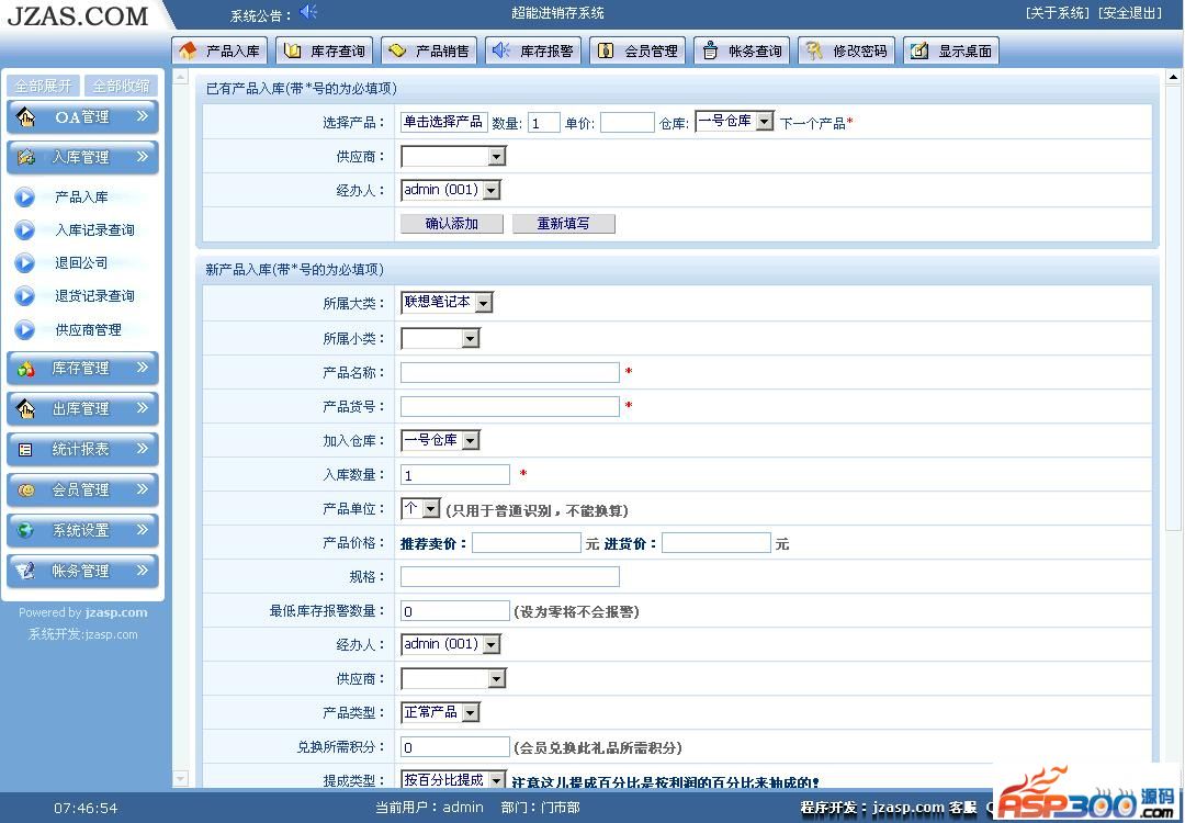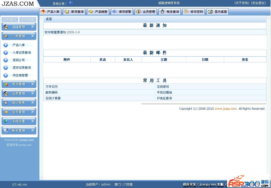 充分利用财务管理、进销存和企业电子商务系统, 整个系统主要由入库模块, 销售模块, 库存管理模块, 统计模块, 会员模块及帐务管理系统构成. 这些模块基本涵盖了各类企业对进销存管理软件的要求. 运行效率, 负载能力, 安全等级, 功能可操控性和权限严密性等方面都在原有的基础上, 更上一层楼.