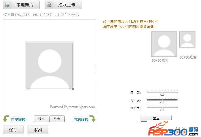 安装及部署:1. 懒人用户可以直接运行aspweb.exe(小型IIS服务器)即可打开页面,或者上传到 apache,iis,tomcat 服务器,通过域名访问 index.html 例如:http://localhost/index.html2.程序源代码里都有备注,一看就能明白3.功能介绍:1.上传并预览,用户可以任意选择区域,支持头像旋转2.支持JS脚本上传4.支持亮度,对比度,饱和度修饰5.支持头像拍照保存6.支持php,asp,jsp,asp.net 调用7.兼容性好,任何浏览器 IE10, IE9, IE8, IE7 IE 6 ,firefox, chrome 都正常使用4.注意事项:1.确定存储图片目录可写权限, iis+win 存储图片目录是 everyone 用户,apache+linux,需要可写权限(777)5.调试方法:安装firebug,F12->网络->所有