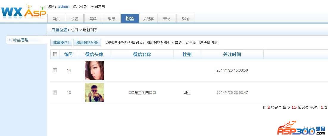 Wxxasp V1.2 2014-5-1更新说明:1、增加高级接口AppId,AppSecret2、增加自定义菜单3、增加粉丝管理4、增加回复粉丝功能5、增加智能回复功能6、增加公众号认证判断7、增加关键字分页8、修正微信通讯接口的sha1加密9、修正登陆判断10、修正Show的字符转换