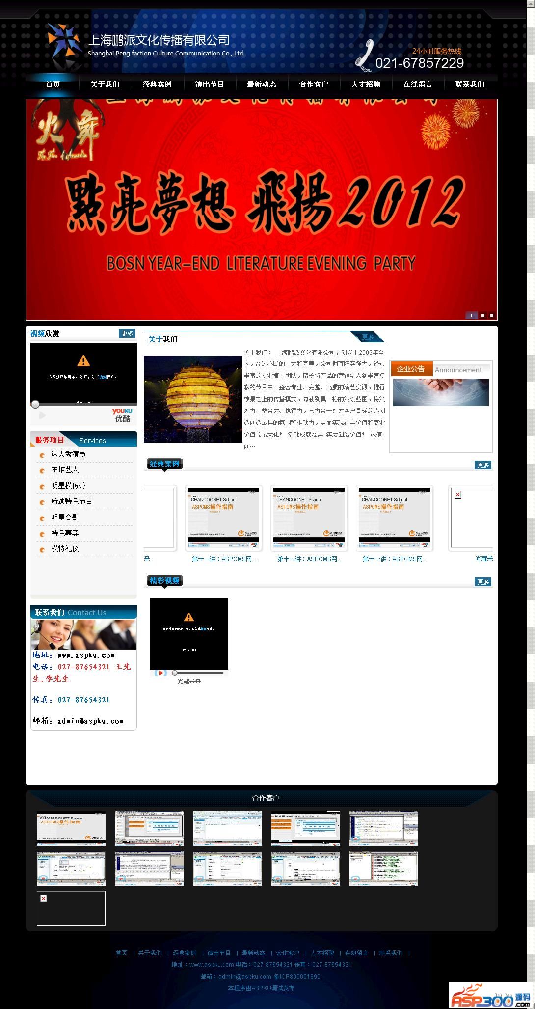 ASP文化传播公司网站源码是一款基于ASPCMS内核开发制作的企业类网站源码,网站界面采用黑蓝色设计!包含:经典案例、节目演出、合作客户、最新动态、在线留言等模块。首页Bananer广告位后台一键修改!