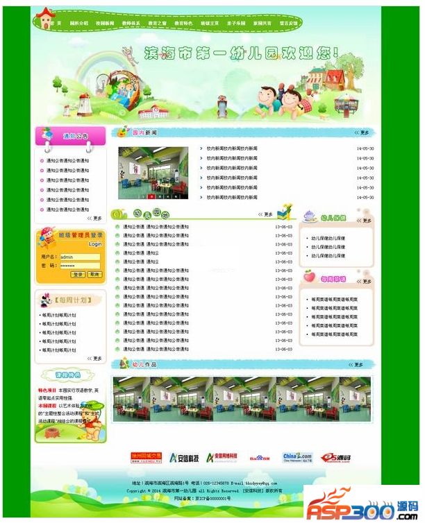 网站栏目框架:1.园所介绍:(1)本园简介(2)校园风貌(3)本园荣誉2.园所新闻:(1)园内新闻(1)通知公告(2)每周计划3.教师体系:(1)园长之窗(2)师资介绍4.教育之窗:(1)教育理念(2)教子科研(3)论文选登5.教育特色:(1)特色课程(2)特色活动6.班级主页:提供幼儿园各班级独立主页浏览.主页包括各班级:班级简介、教学计划、知识快递、温馨提示、每周之星、活动剪影等。7.亲子乐园:(1)亲子作品(1)活动相册8.家园共育:(1)幼儿保健(2)童心解析(3)每周菜谱(4)家教信息9.留言反馈:系统测试:前台班级主页管理员帐号:anny 密码:123456后台路径:/s_admin/login.asp超级管理员后台帐号:admin 密码:admin888