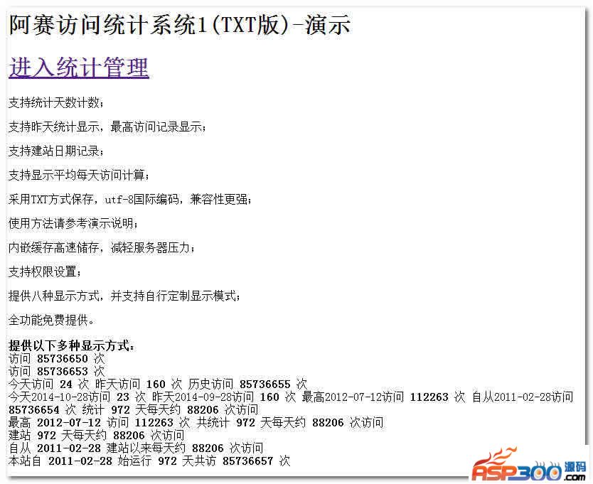 功能特点:支持统计天数计数;支持昨天统计显示,最高访问记录显示;支持建站日期记录;支持显示平均每天访问计算;采用TXT方式保存,utf-8国际编码,兼容性更强;使用方法请参考演示说明;内嵌缓存高速储存,减轻服务器压力;支持权限设置;提供八种显示方式,并支持自行定制显示模式;全功能免费提供。