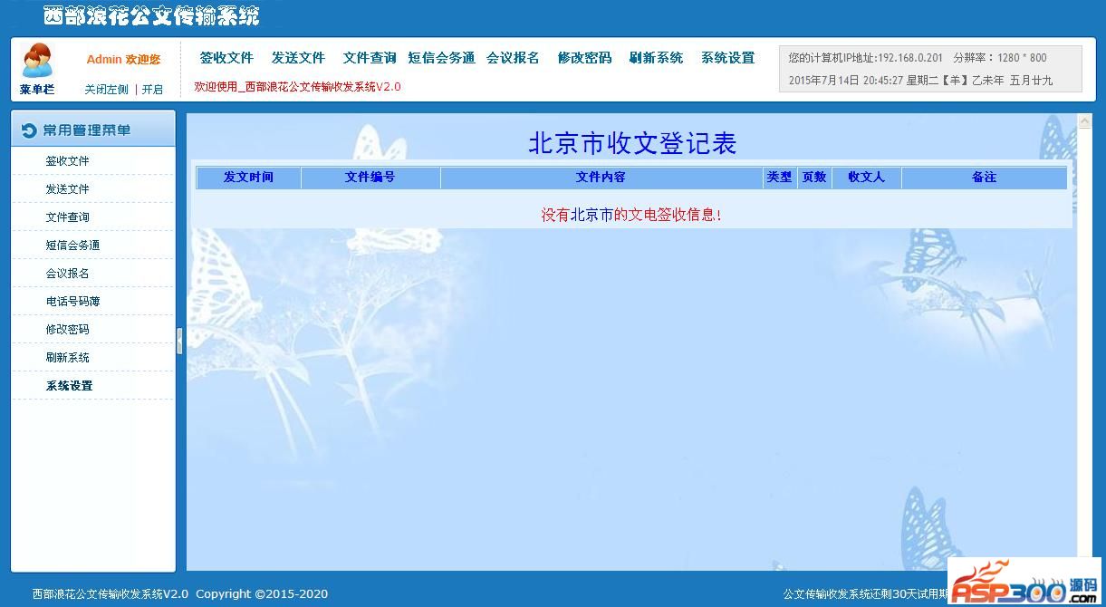西部浪花公文传输系统V2.0集公文收发、文件资料归档查询、短信会务通、会议报名、网络电话号码薄为一体的办公系统,是基某市党政机关公文传输系统系列的升级版,本系统结合之前版所有的版本的优势,风格上重新排版,真对党机关适用性强的,总结了以前版本,去除了少用或无用的功能,真正做到强化简化,不管是在程序的内部结构还是界面风格及CSS上都做了大量优化及性能提升,特别是在发送文件过程中能够自动生成文件编号,自动按后台设置好手机号码发送短信提醒用户接收文件,为用户体验提高一个台阶,本程序适合党政机关架设公文传输系统、二次开发使用。本程序具有体积小巧、程序文件结构严谨、界面清爽简单、功能强大、非专业人士使用入门快、中小企业使用投资小等实用特点。