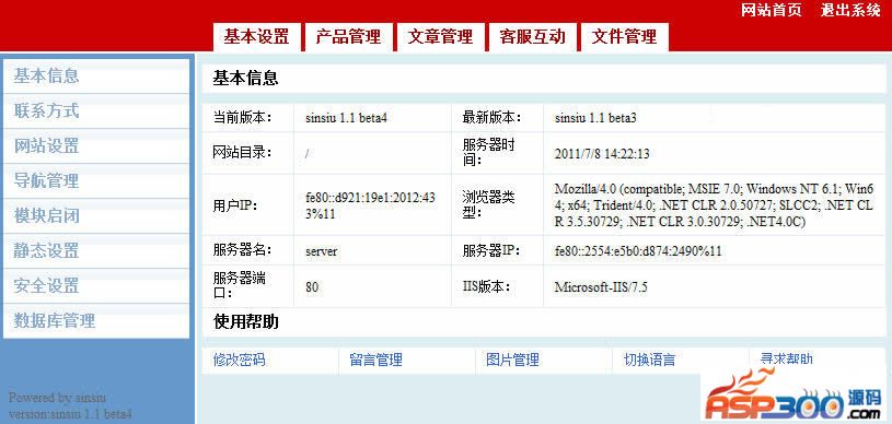 1.基本设置:基本信息,联系方式,网站设置,导航管理,模块启闭,静态设置,安全设置,数据库管理