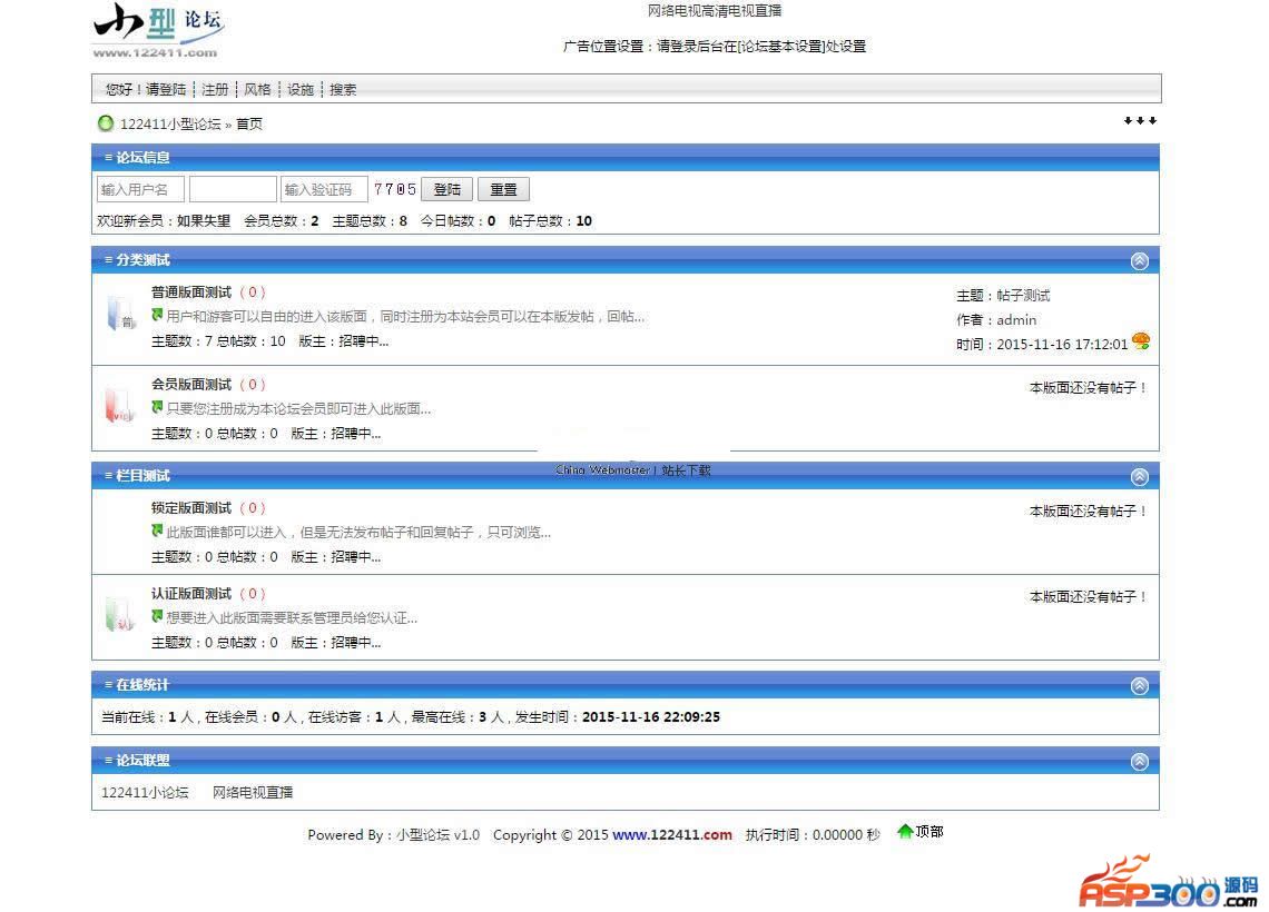 122411小型论坛,小巧高速,安装方便、通用界面、容易上手,XHTML+CSS架构,独创分库存贴技术,打造个性化精良