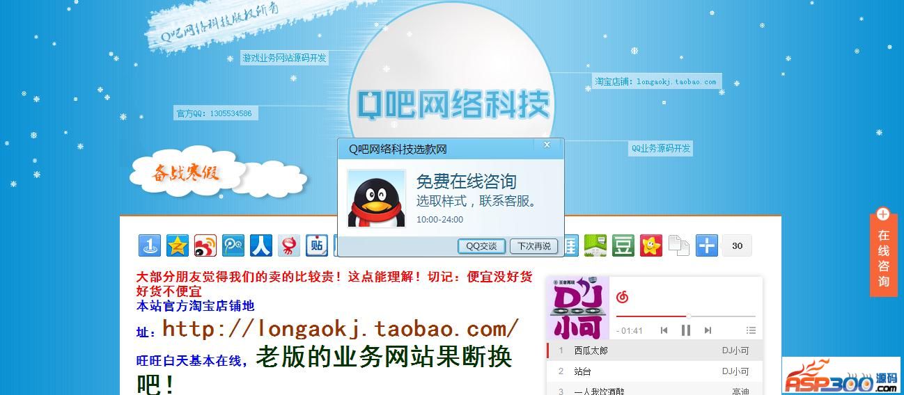 蓝色QQ业务选款网源码 源码为asp 后台账户密码admin admin 后台可上次源码图片。修改价格、 首页音乐,客服功能,访问统计,更美化了页面。 下载地址 下载地址已转移到新版网站,请点击左上角-首页,在新版网站搜索此套源码的标题进行下载。
