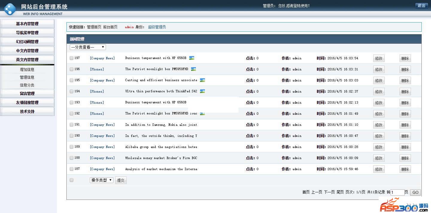 【英文信息管理】 可以发布英文网站的公司新闻和业内最新资讯,可增加多个一级栏目