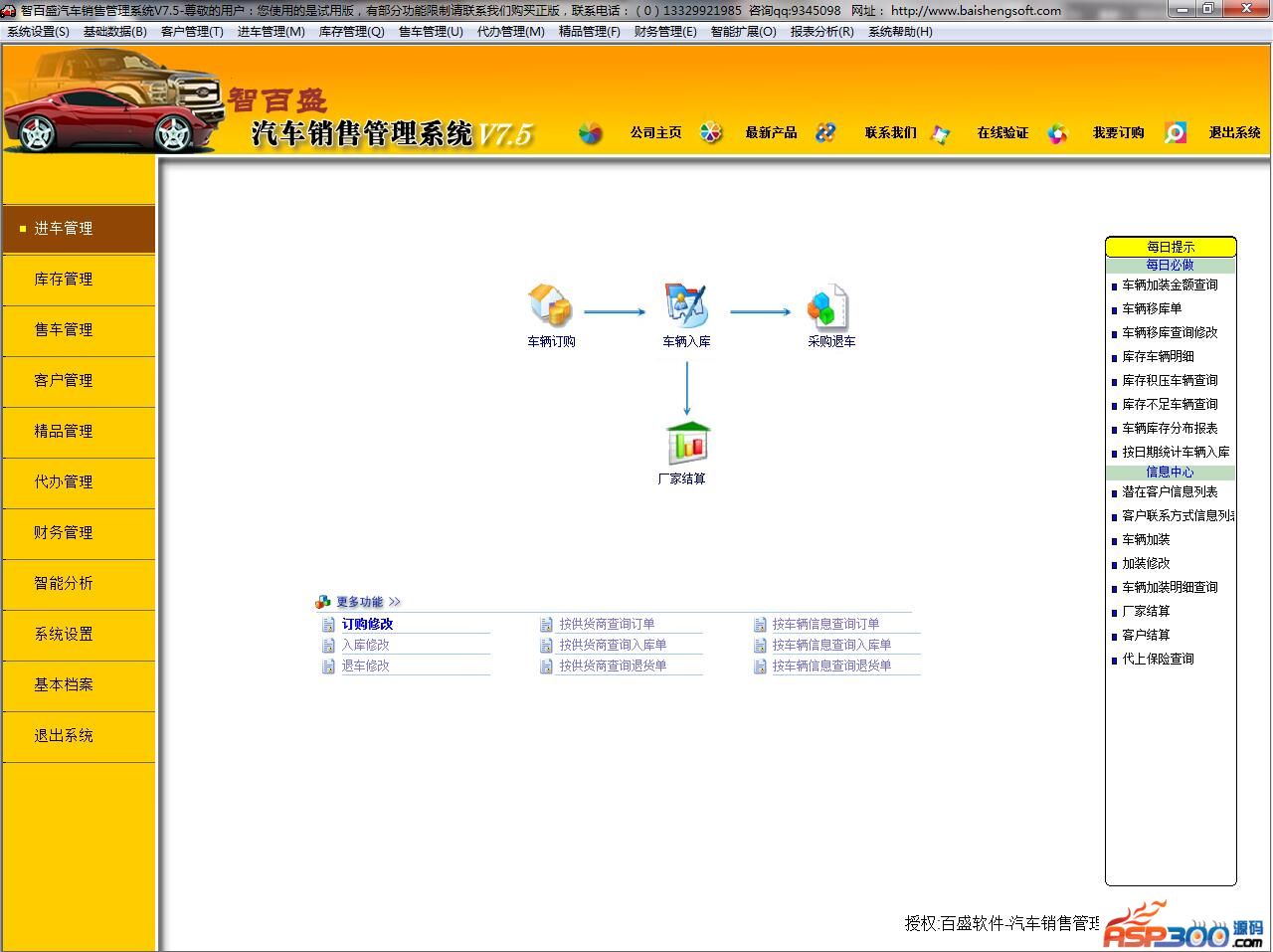 智百盛汽车车直营(综合)店管理系统V7.5新增了精品管理模块,完善了财务管理里的客户、供应商费用、预付款等功能点,将软件的界面调整为流程图形势。更贴合汽车销售企业的业务管理模式,也方便了使用者操作使用。