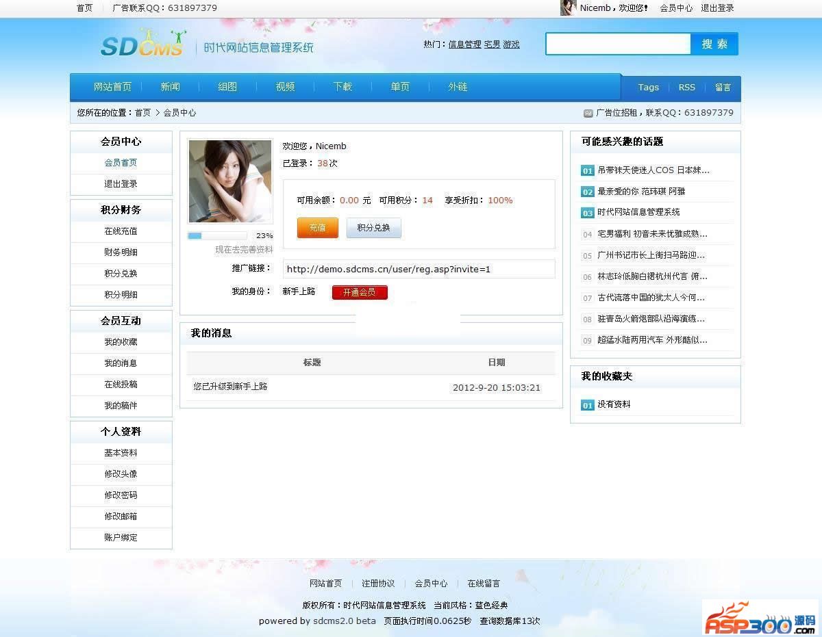 SDCMS门户版主要包含:文章、组图、视频、下载、单页、外链等模块,系统内置会员模型:会员组,VIP会员,积分购买,会员投稿,投票,评论,留言,心情,搜索,标签,头像组件,在线充值,支持QQ、新浪微博、支付宝等账户的一键登录登功能,是您快速建立类似A5,站长之家之类门户平台的良好选择。
