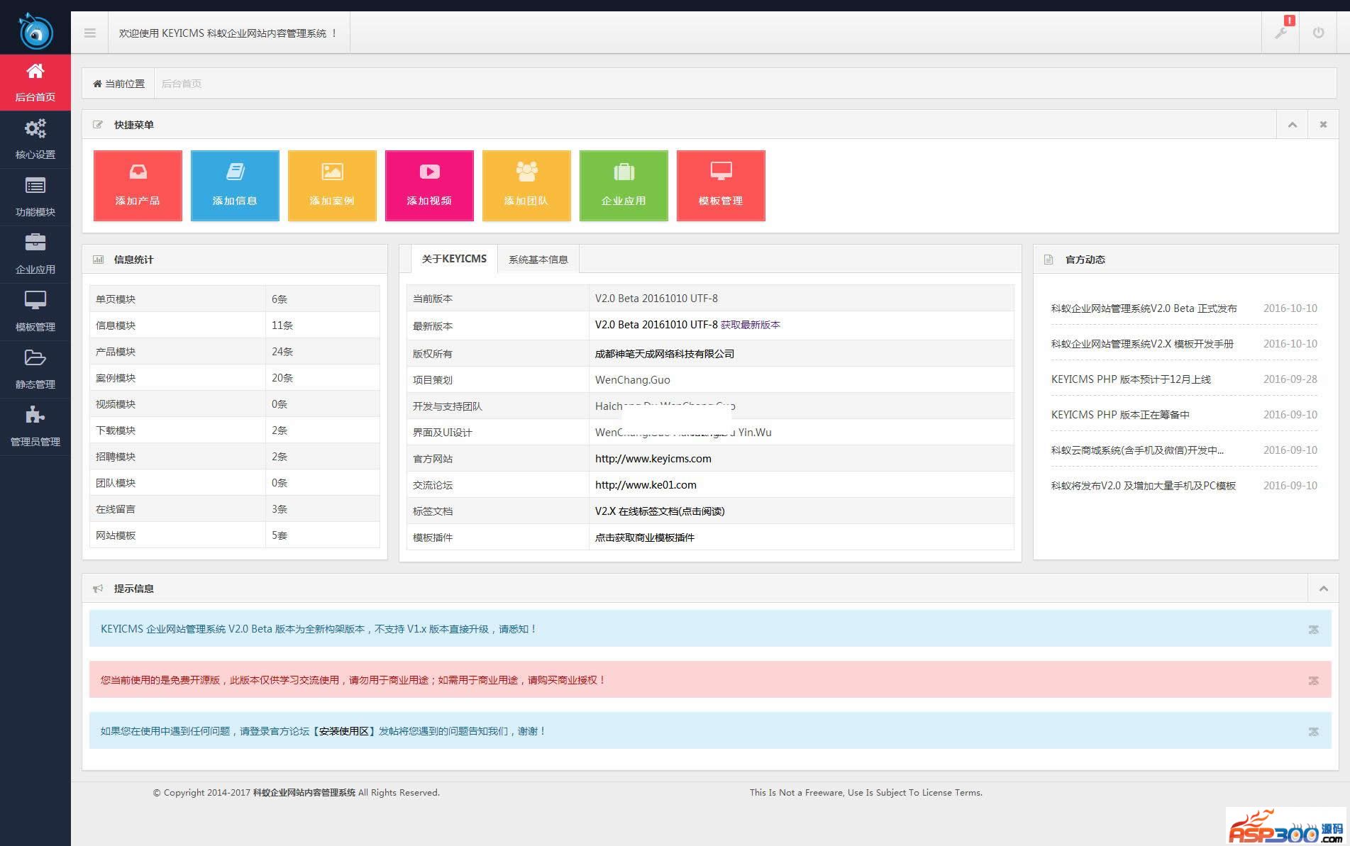 1、主要功能包括:后台首页、核心设置、功能模块、企业应用、模板管理、静态管理、管理员管理等核心功能;