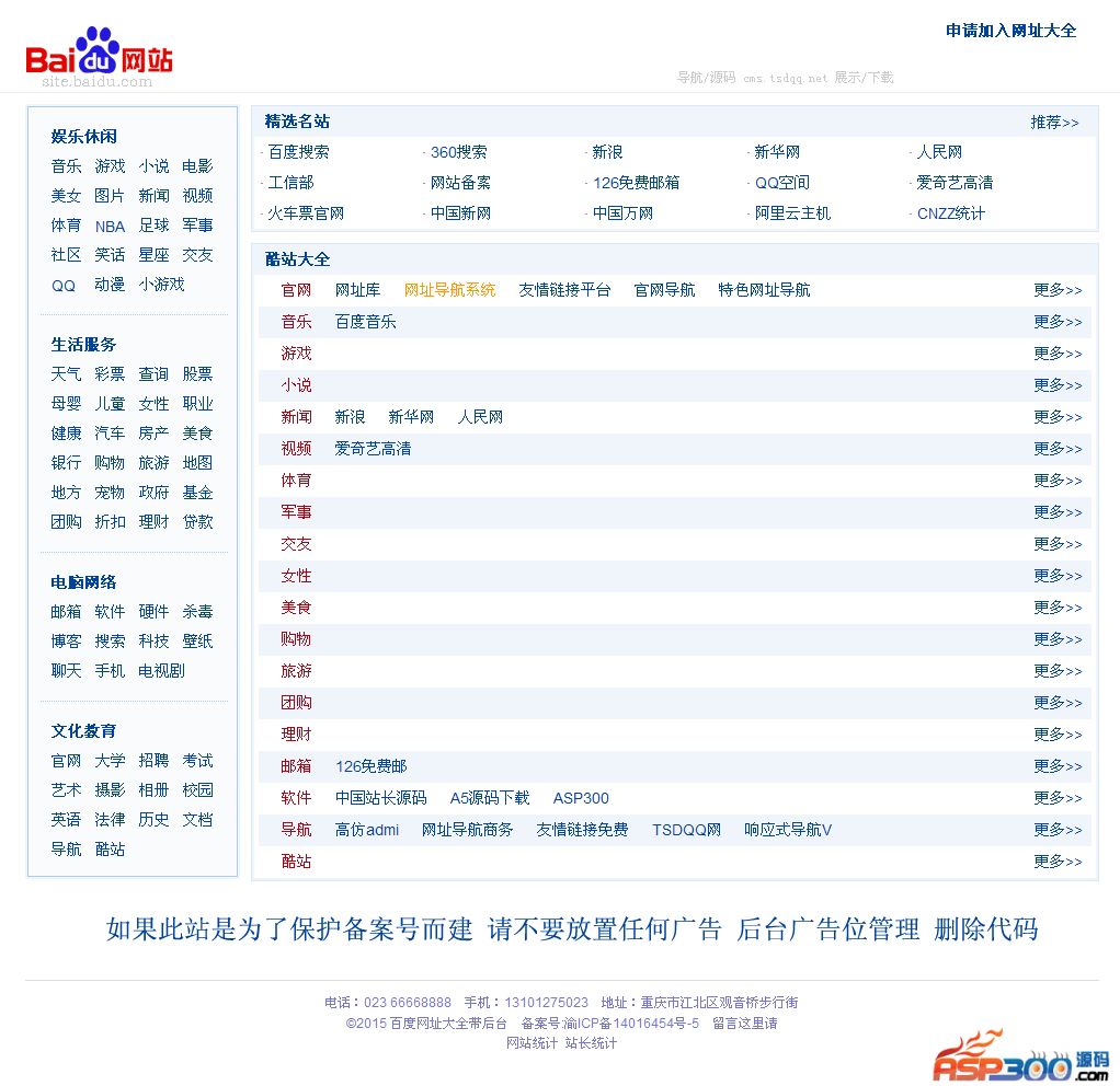 百度网址大全带后台简介:1、本系统使用TSDQQ网址导航内核,保留了基本常用功能,后台无限制,兼容现代主流浏览器。2、网站无预留后门,无病毒,通过自带的程序,本地IIS,上传至空间任何目录均可直接使用。3、此版为免费版 语言版本:GB23124、设有在线提交网址,并且可以设定是否开启。后台功能齐全,如果不能使用,说明你不是在正规站点下载的。5、全站有3个广告位。6、设有网址检查程序,轻松发现不能打开的网站即可关闭。7、导航增加了一个归类标签,这个功能可以使首页【左边分类】有变化。