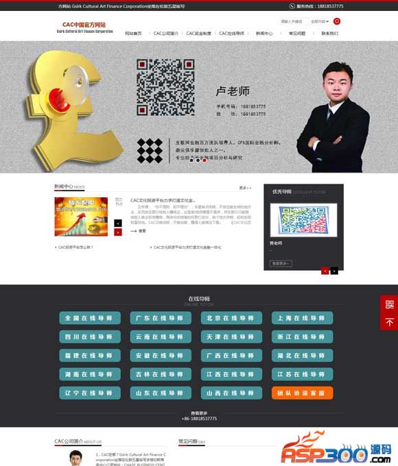 界面采用黑白灰的简约色调,显得庄重自然非常大气,因为一般的投资类平台官方网站肯定会有很多的导师宣传团队,所以这套官方网站也不例外,在首页有一个在线导师分类展示的板块,可以按照地区展示并归类在线导师,点开对应地区的在线导师以后会显示该地区所有导师的姓名、联系方式、QQ回话链接、微信二维码等基本信息,方便各个地区的消费者在了解投资平台信息时对接当地的导师团队。