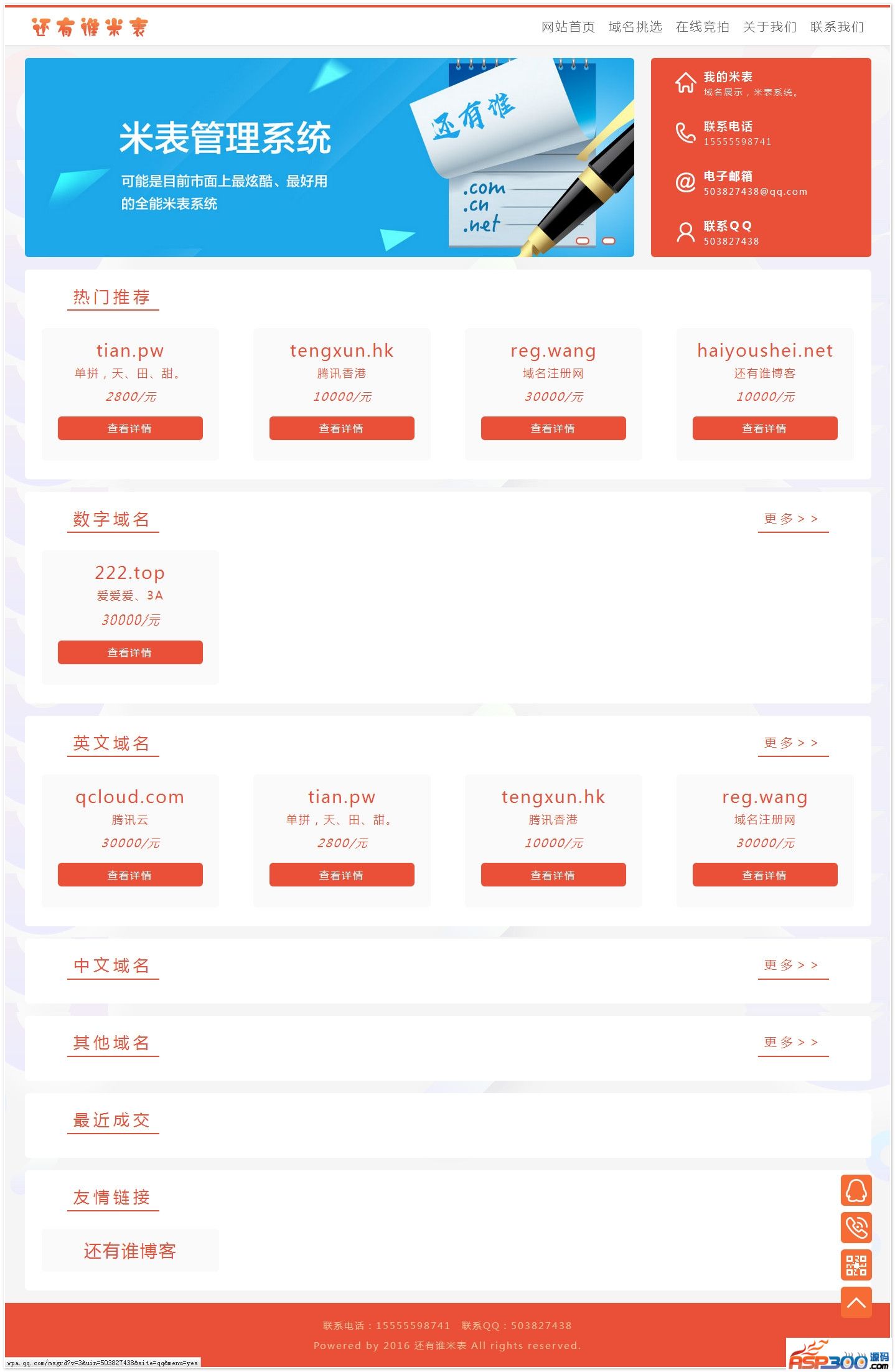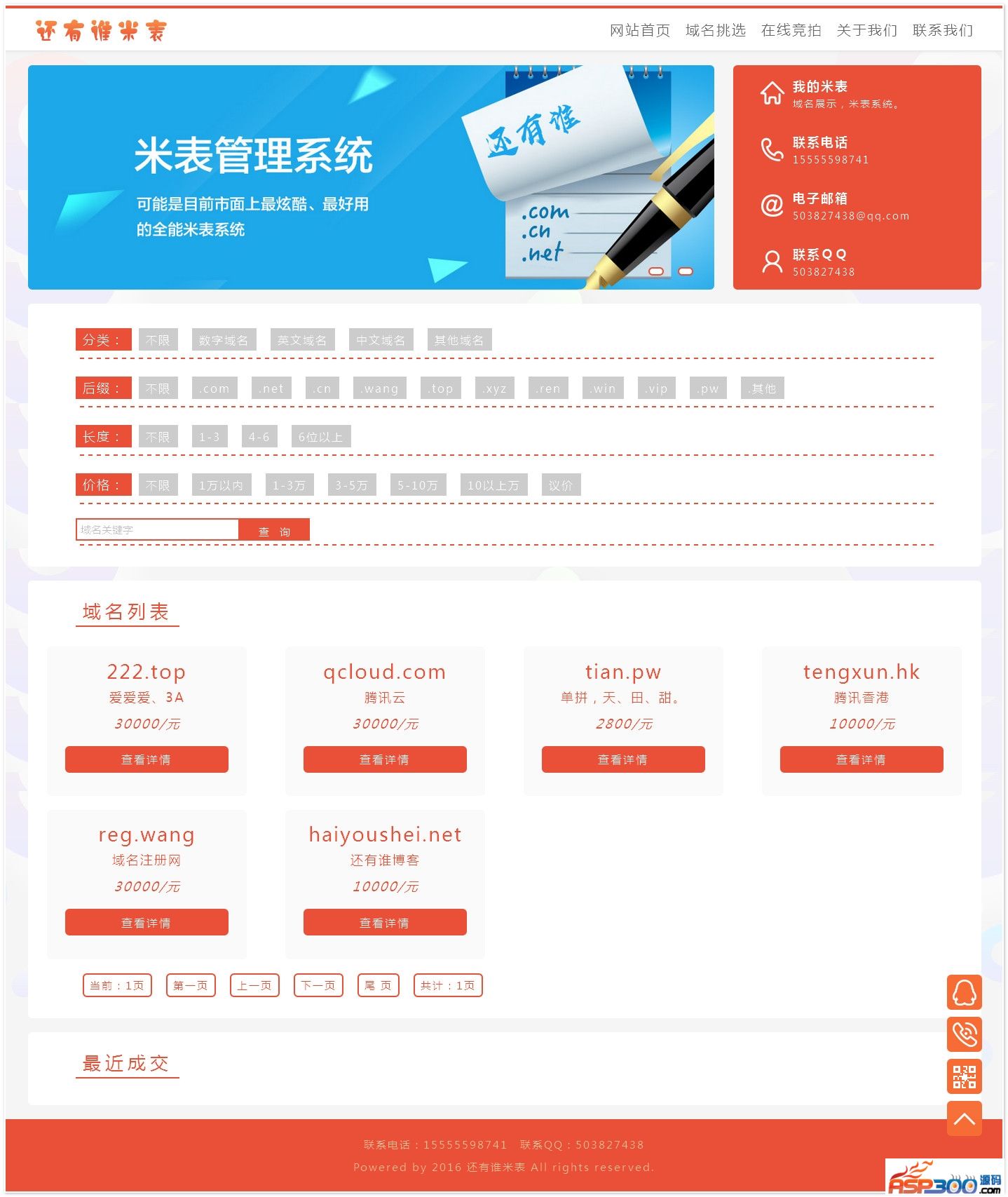还有谁米表管理系统有域名挑选和在线竞拍两大功能,前端是响应式橘红色风格,大气简洁上档次。由还有谁博客博主张世奇制作,方便操作简洁易懂,非常适合新手米农搭建使用,采用ASP+ACCESS形式,免安装,上传至空间即可使用。后台目录:hys/index.asp默认帐号:admin 默认密码:admin数据库目录:data样式目录:styles图片目录:images特效目录:js