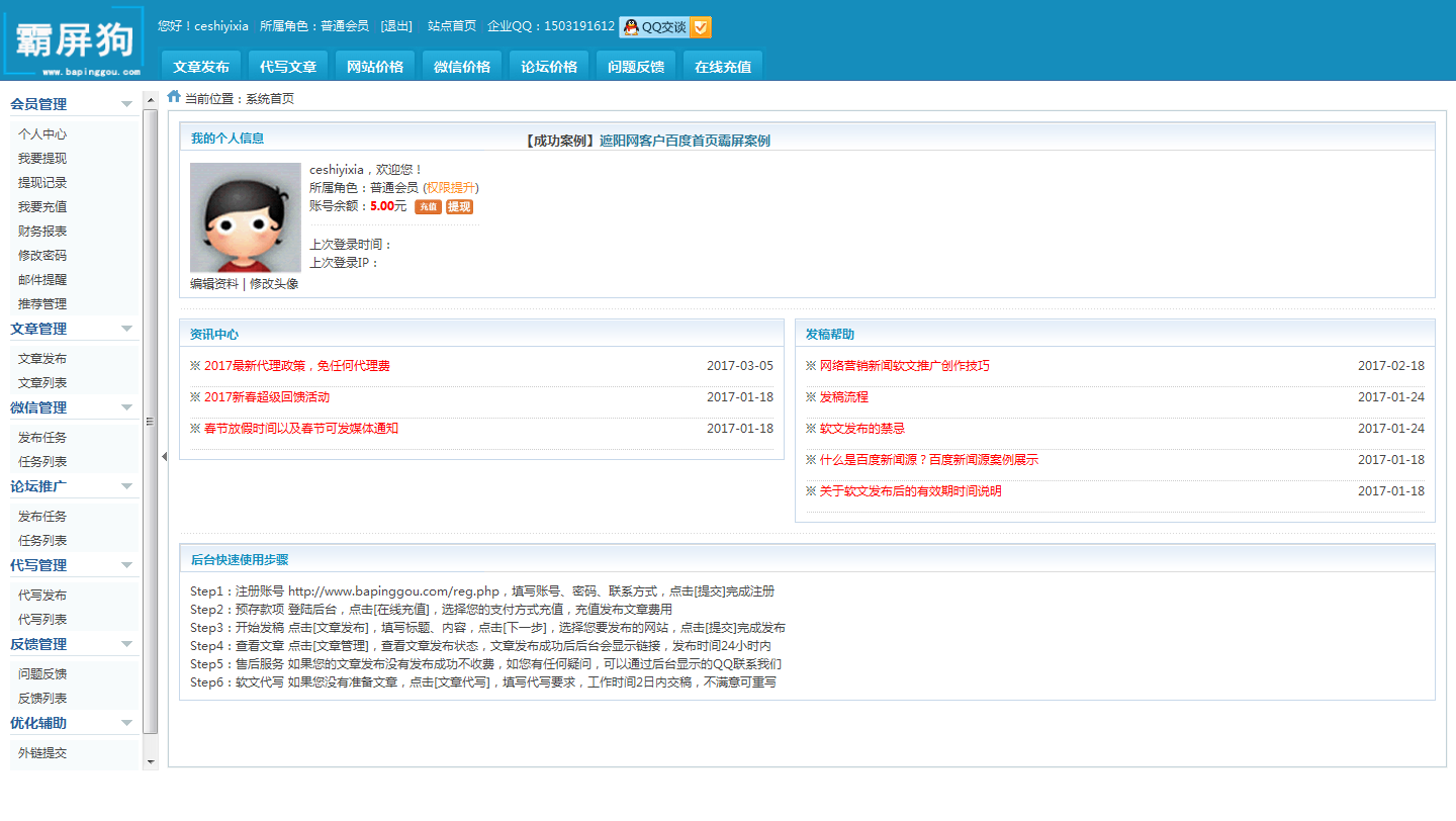 新闻软文自助发稿平台源码,优于市面所有的同类程序,是一款基于PHP+MYSQL设计制作的网站系统。完美复制霸屏狗软文平台的邀请返现功能。会员身份划分明确,会员自助发稿,发文流程清晰。支持媒体入驻,在线结算,管理更轻松! 下载地址 下载地址已转移到新版网站,请点击左上角-首页,在新版网站搜索此套源码的标题进行下载。