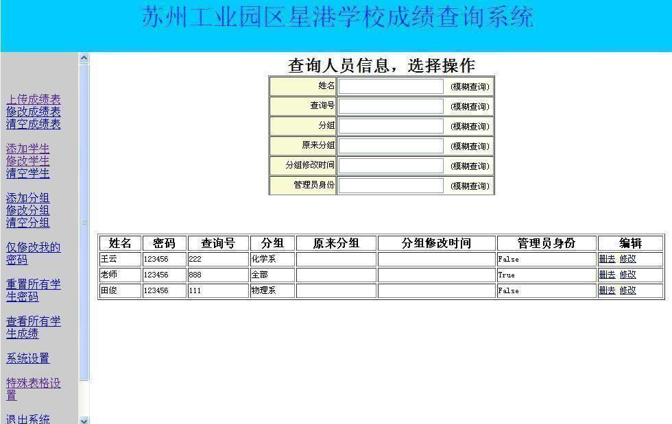 成绩查询系统 更新日志: v4.5.0与v4.4.0相比1.查询特殊表格,换了算法,速度提高了很多2.查询名设置更加合理 v4.4.0与v4.3.2相比1.支持2010版本的excel2.增加了多行显示 v4.3.3与v4.3.2相比1.修改了批量上传人员的bug v4.3.2与v4.3.1相比1.表格内容居中2.修改了删除人员的bug3.删去了框架结构