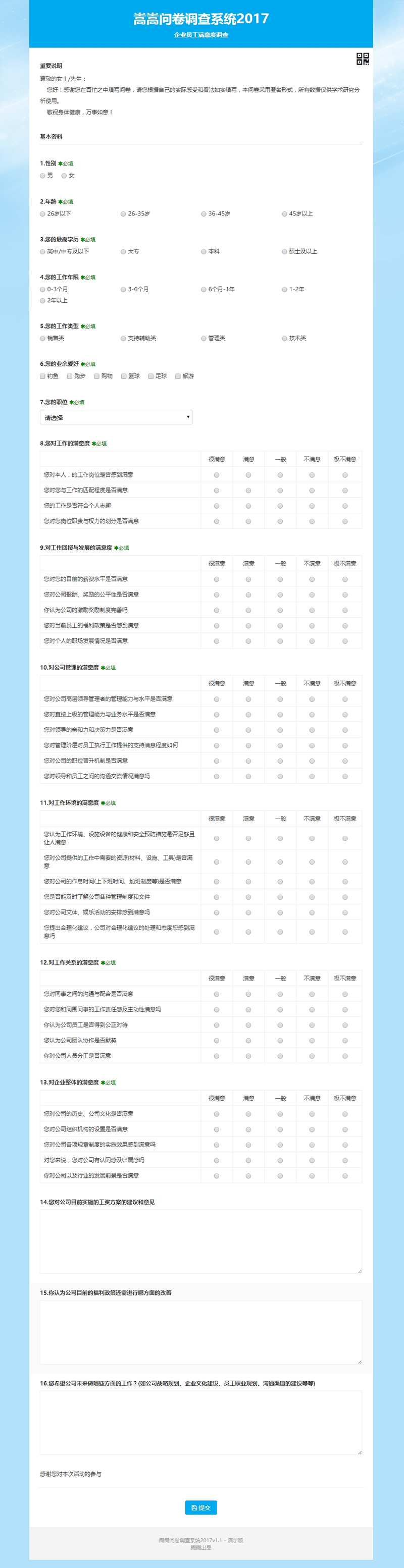 嵩嵩问卷调查系统2017是一个以asp+access进行开发的asp问卷调查系统源码。问卷设计1.单行文本2.多行文本3.单选框4.多选框5.下拉框6.多级下拉框7.组合单选框8.日期时间9.图片上传10.附件上传简单的设置即可设计一个实用的问卷自动生成二维码,手机扫一扫通过手机访问其它